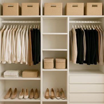 We focus on organizing, containing, and decluttering, a method designed to create clarity and calm. First, we organize by thoughtfully sorting and categorizing your items with intention. Then we contain, using functional tools like bins, drawers, and trays to give everything a designated home. Finally, we declutter by helping you release what no longer serves you, making space for what truly supports your lifestyle.